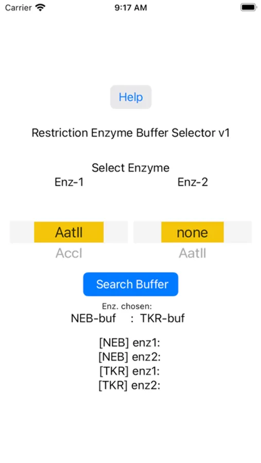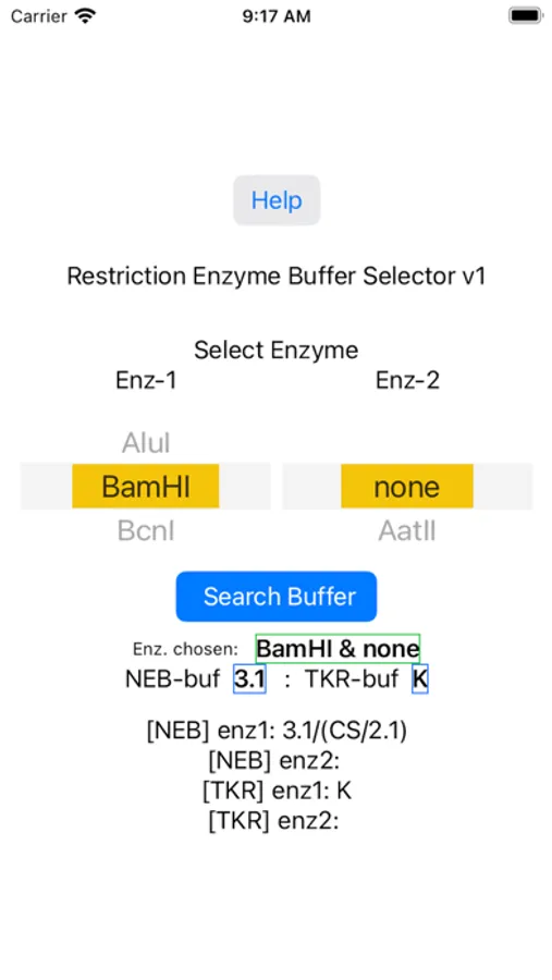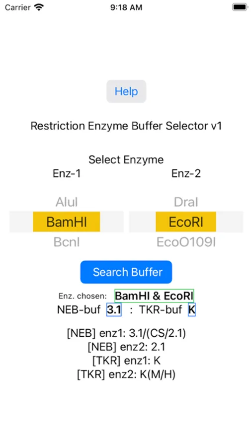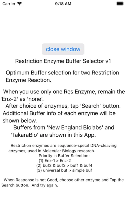 This App is designed for Molecular Biology Research; for Researchers and University Students. You can get the information to choose the 'reaction buffer' of 'restriction enzyme'. Enzyme buffers listed are from New England Biolabs and TakaraBio. When you will use two Restriction enzymes at once, this App will help you to select the reaction buffer.