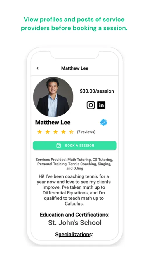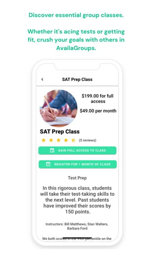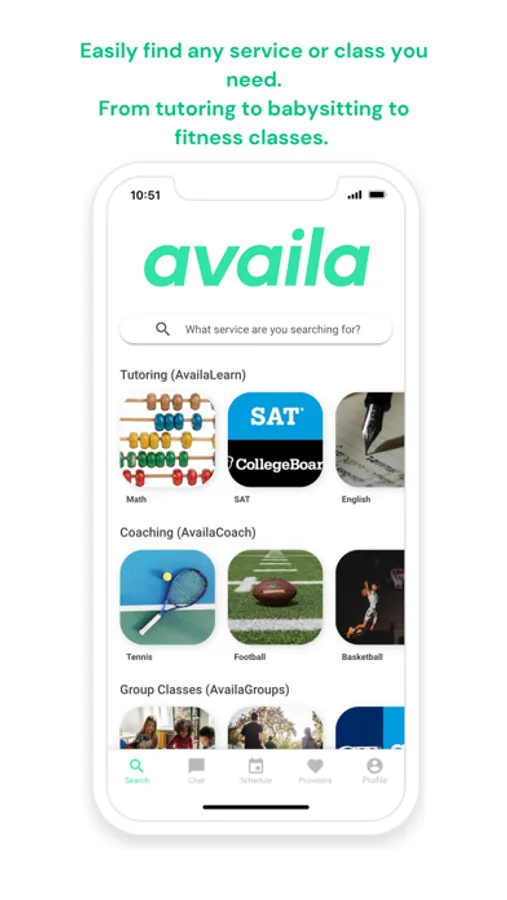 Customers can easily find tutors with AvailaLearn, coaches with AvailaCoach, group classes with AvailaGroups, home services like babysitting or cooking with AvailaHome, and entertainment for events with AvailaEntertain. Search for services you need, book an available time a tutor or coach listed or request a time if you're booking a home care or entertainment service, pay for the session, and add the appointment to your calendar.