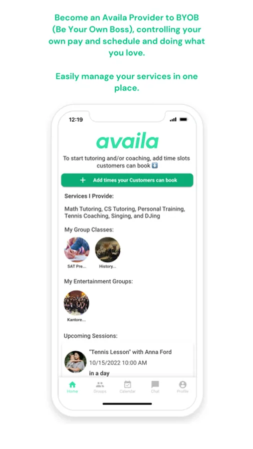 Become an Availa Provider to BYOB (Be Your Own Boss), controlling your own schedule and pay and doing what you love. Availa Coaches and Tutors list times they're available, customers pay for sessions to book those times, and the session shows up on the upcoming events for both the Customer and the Provider.