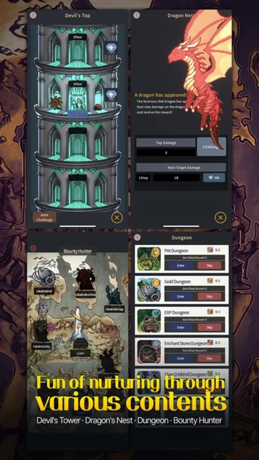 Exciting contents like dungeons, Devil’s Tower, Dragon’s Nest, Bounty Hunter, and World Raid!