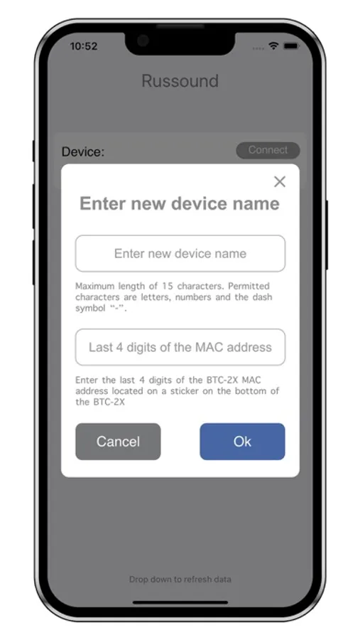 The Russound BTC-2X Naming App is required to update the friendly name of the Russound BTC-2X Bluetooth transceiver.