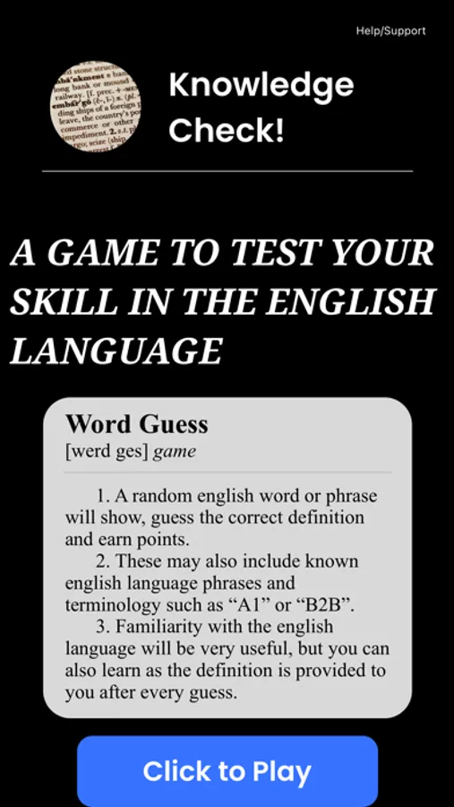 A game to test your knowledge of the English language. Try and see how many definitions you know, or use it to learn new ones.