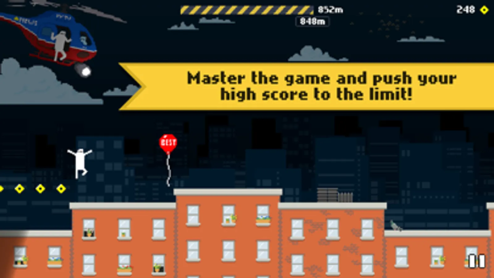 Rooftop Ramble is a fast-paced, easy-to-learn but hard-to-master endless runner game set in a retro-inspired pixel art city. Lunge from building to building while jumping over and sliding under obstacles to keep improving your best score.