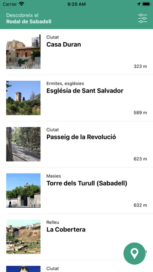 Tant en el mapa com en les fitxes, l’aplicació us informa en tot moment de la distància en línia recta de qualsevol element respecte al punt on us trobeu.