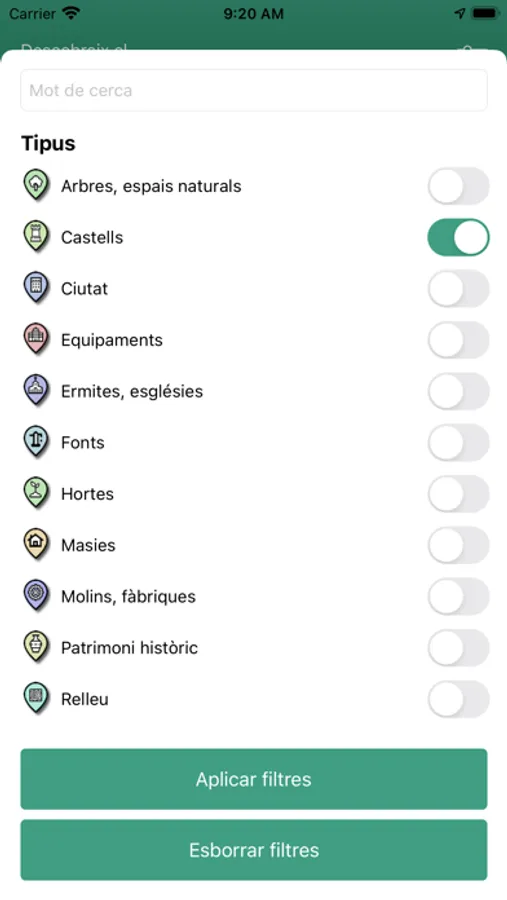També té un potent cercador per demanar-li que us situï sobre el mapa o la foto satèl·lit qualsevol element del rodal. O que us obri la fitxa explicativa amb les fotos. A més, podeu aplicar-hi diversos filtres per veure només els tipus d’elements que més us interessin.