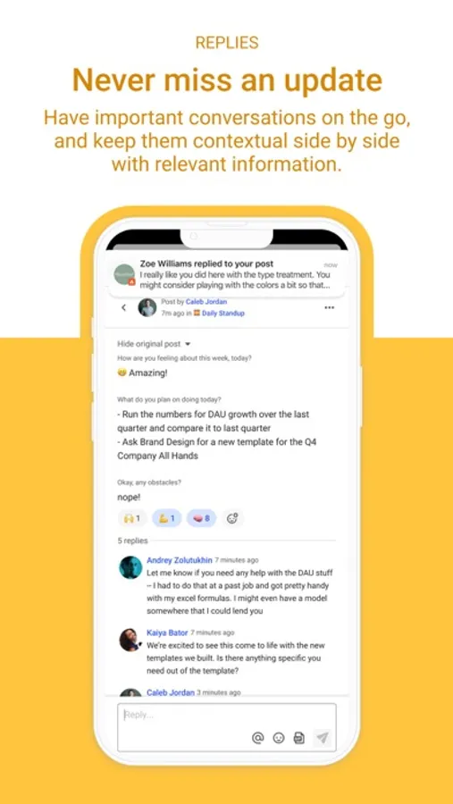 Improve internal communications workflows with the ask me anything (AMA) template, general news feed, get help template, group feed, icebreaker template, idea management template, internal wiki tool, knowledge base, daily standup meeting, team retrospective and weekly updates.
