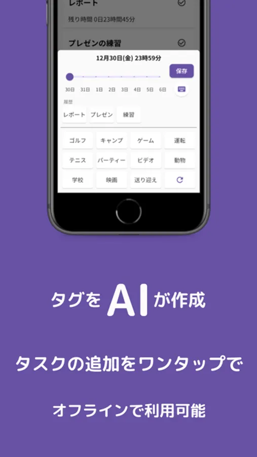 タスク追加をより簡単に、短時間で行うことができます。基本操作はタップで可能です。タグの組み合わせによるタスクの追加を行います。タグはgpt-3を利用して自動生成しています。日付の設定はスライドで行うことができます。このアプリを利用したより良い生活を行ってみませんか。