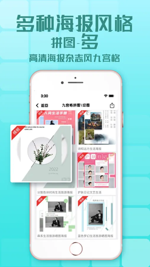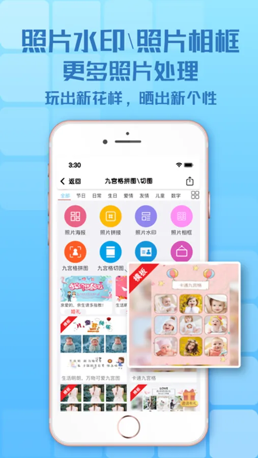 支持海量九宫格、六宫格等切图模板,有爱心形、梅花形、苹果形等,更有杂志时尚海报封面风格的精美九宫格拼图模板可以免费使用,一分钟让您制作出精美的九宫格图片海报等,没有广告,免费制作使用,用的好的帮我们推荐更多的人哦,你的使用就是对我们最大的支持,使用上有问题或是有需什么好的建议反馈,或是需求、合作等欢迎随时反馈给我们QQ:1553988453