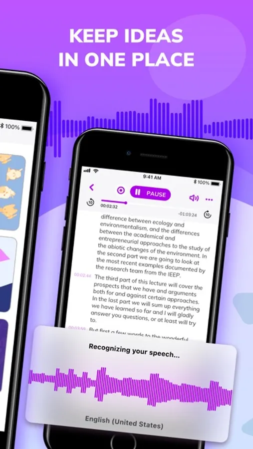 Create voice and text NOTES by only clicking the REC button! This audio planner is a universal tool for recording LECTURES and MEETINGS, instant speech recognition, translation, and even keeping a personal diary.
