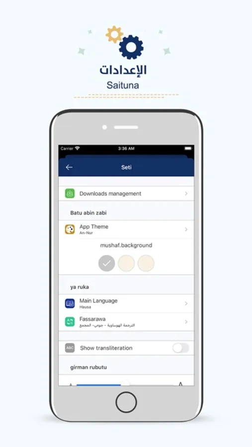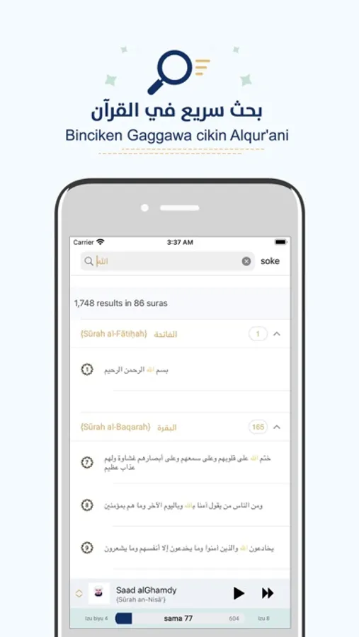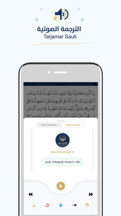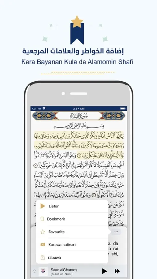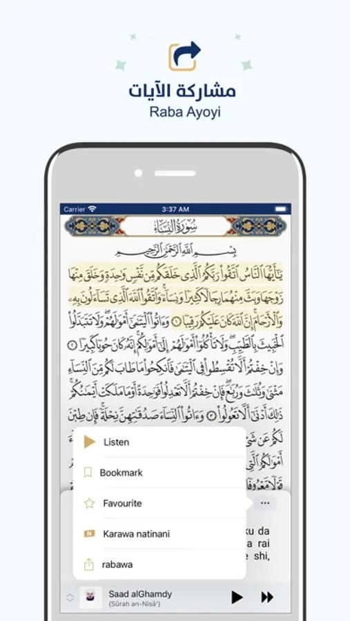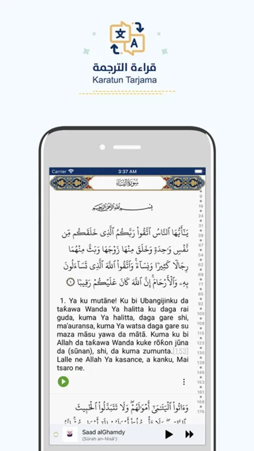 - Tarjama ta Sauti: Sauraron Tarjama ta Sauti na Ma'anonin Alƙur'ani Mai Girma da Yaren (sunan yaren a nan)