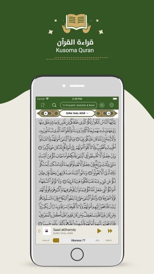 Unaweza kupakua Programu na kuvinjari Qur'ani Tukufu pamoja na tafsiri (Hapa jina la lugha) kwa njia rahisi na nyepesi zaidi na kwa ubunifu mzuri wa kuvutia, uliobuniwa na wachoraji mahiri wa mapambo ya Qur'ani katika ulimwengu kwa muonekano wa kuvutia.