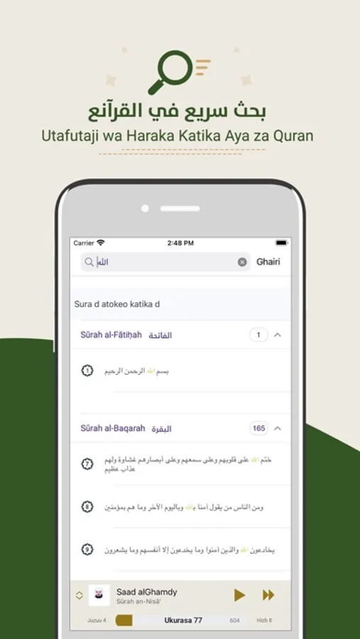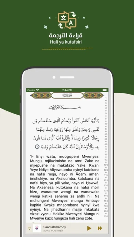 - Tafsiri ya maana ya maneno ya Qur'ani Tukufu, ifahamu Qur'ani Tukufu kwa lugha yako kupitia tafsiri ya maana yake katika lugha ya Kiswahili