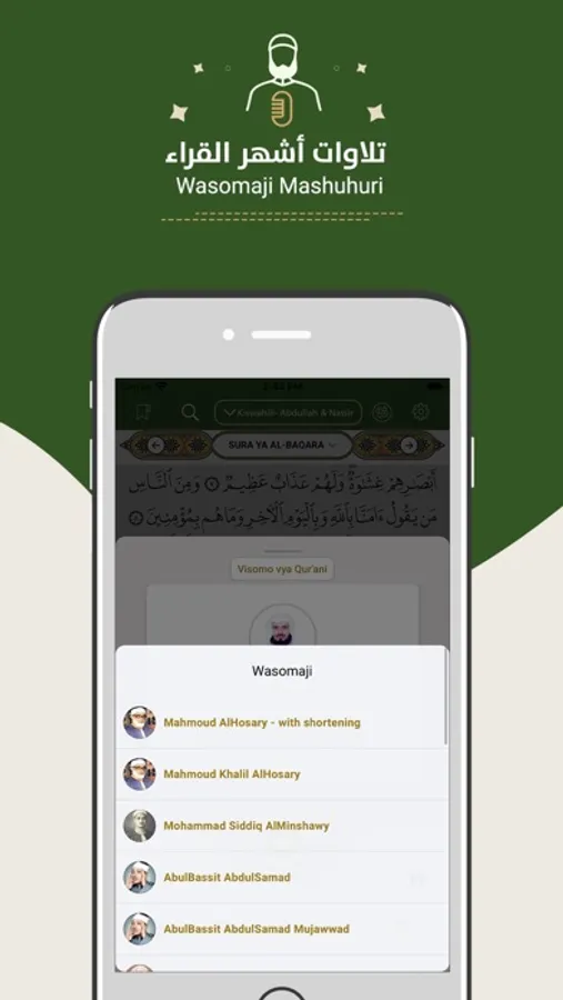 - Visomo, Kusikiliza kisomo cha Qur'ani Tukufu kwa sauti za wasomaji mashuhuri na wenye visomo vitamu.
