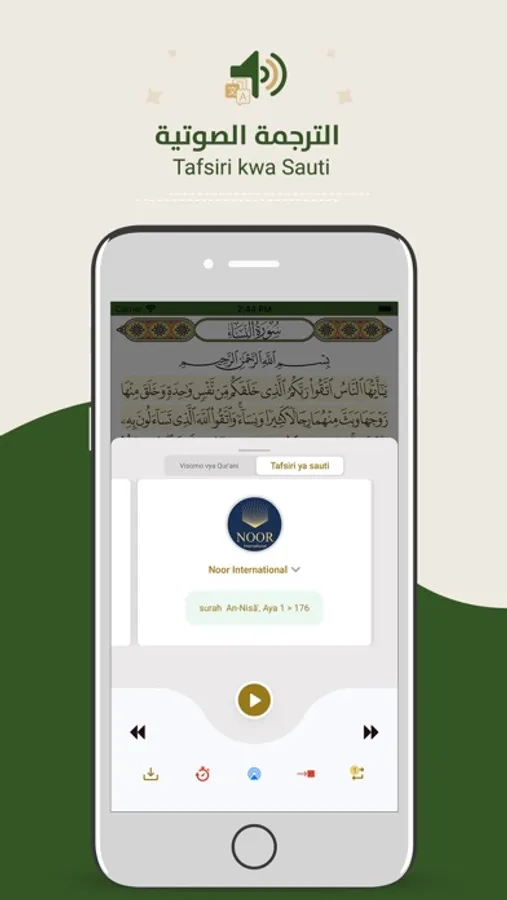 - Kicheza sauti cha hali ya juu: Opereta inakupa uwezo wa hali ya juu, mfano kurudia rudia kwa ajili ya kukusaidia kuhifadhi Qur'ani Tukufu.