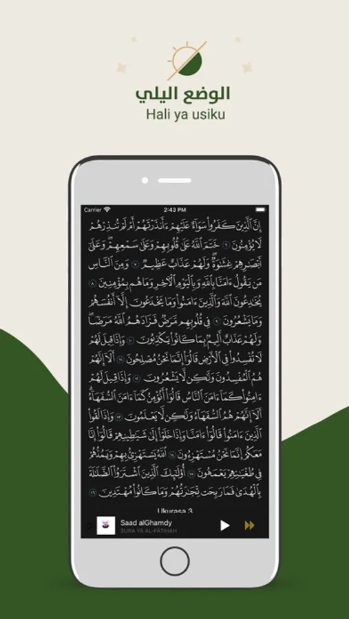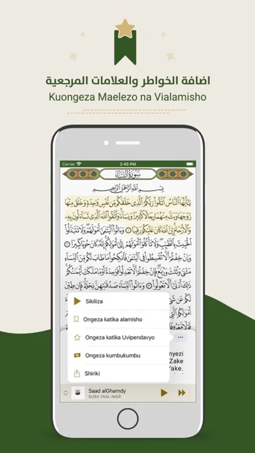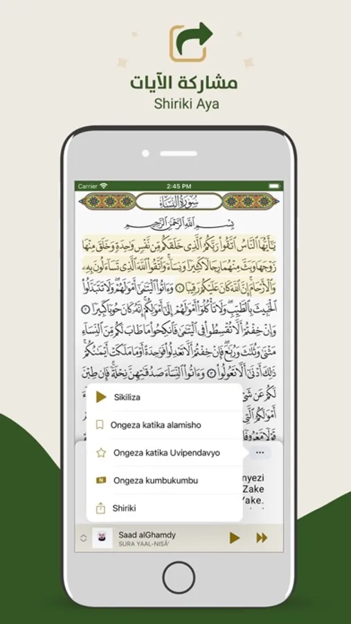 - Kushiriki: Kushiriki aya au maana yake kwa marafiki zako kupitia Apilikesheni na mitandao ya kijamii.