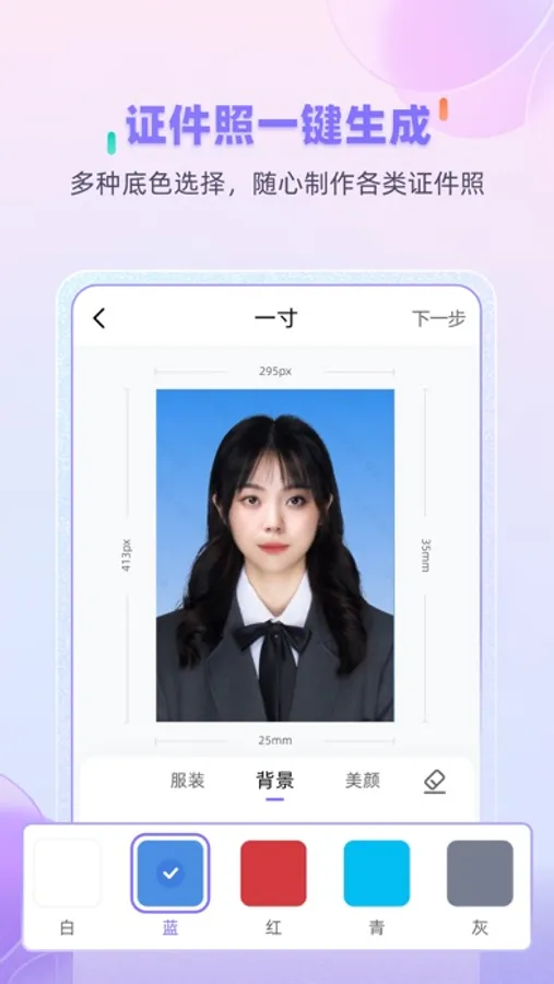 AI精准识别照片元素,自动去除复杂背景保留人像,无需手动选取抠除,可以任意更换照片底色和照片尺寸,制作各类尺寸证件照,足不出户,即可一键生成证件照!