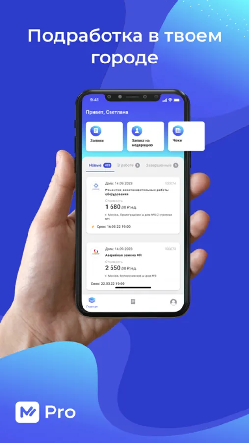 M-Pro - приложение для прямого взаимодействия заказчиков услуг и исполнителей. Самозанятые исполнители легко найдут подработку и смогут получить вознаграждения за свою работу.