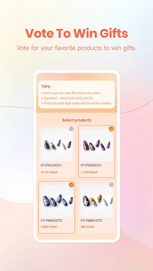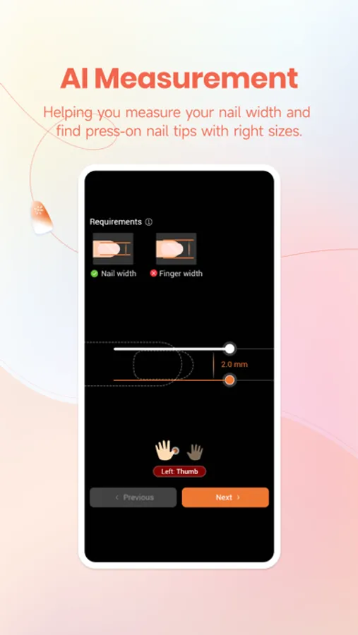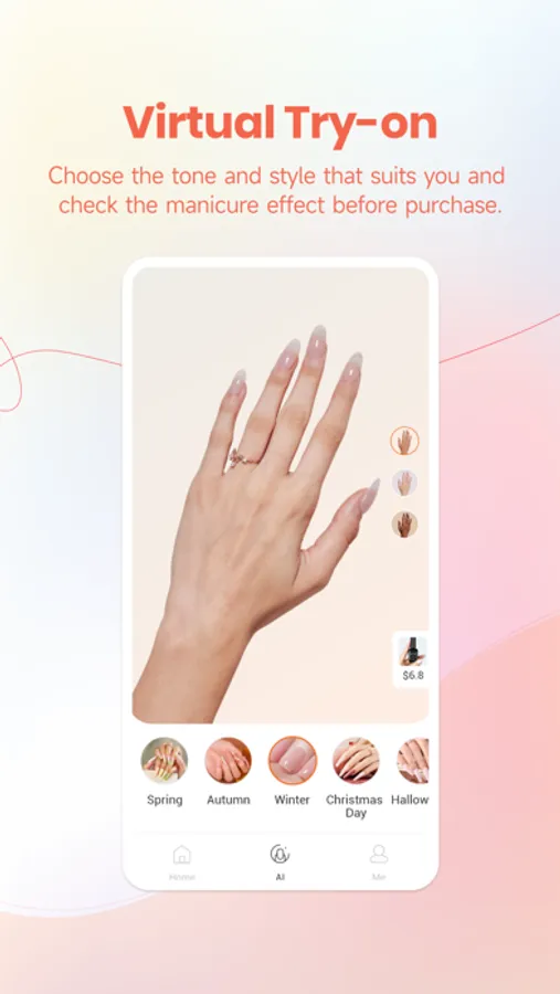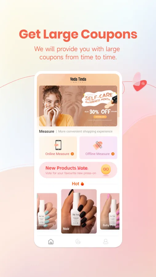 Veda Tinda Nails app provides press-on nail tips to help nail lovers create their own manicure styles. You can choose the manicure products faster and more accurately on it. It uses AI measurement technology to help you choose the nail tips for your nail size. You can also check the manicure effect before purchase by "trying on" online. We can also develop the products you want according to your vote!