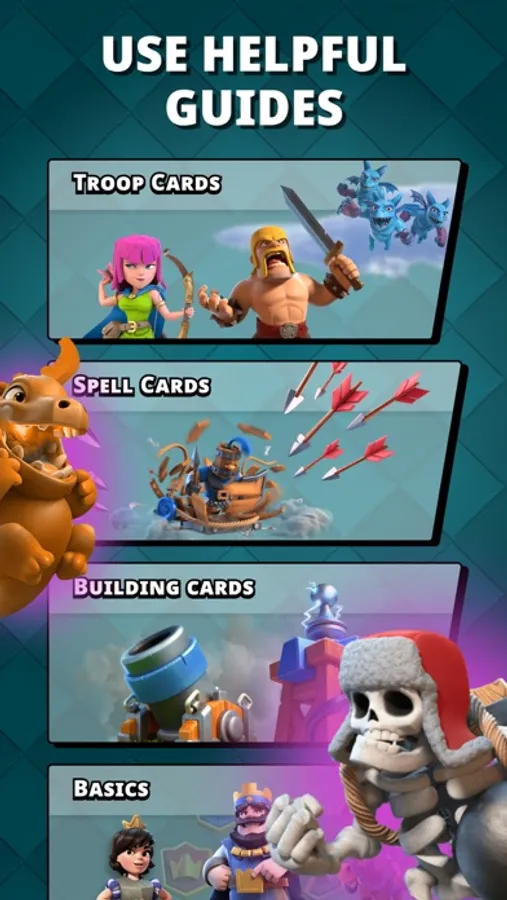 Deck Hacks for Clash Royale is your personal gaming companion app that will help you build the strongest deck for easy and quick wins in the game. The app contains a complete collection of cards of any type of quality. You can find out absolutely all the information about each card and simulate a battle between cards to see how strong your deck is.