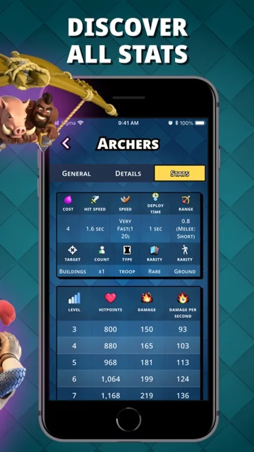 You can also compare the characteristics of any two cards that are in the game. Specify the level of the card and you will be shown their strengths and weaknesses. For comparison, such characteristics as cost, health points, damage, damage per second, attack speed, and running speed are used.