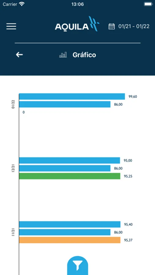 No gráfico de acompanhamento acompanhamos a evolução do indicador mensalmente ou no acumulado e também conseguimos saber se a meta foi atingida ou não.