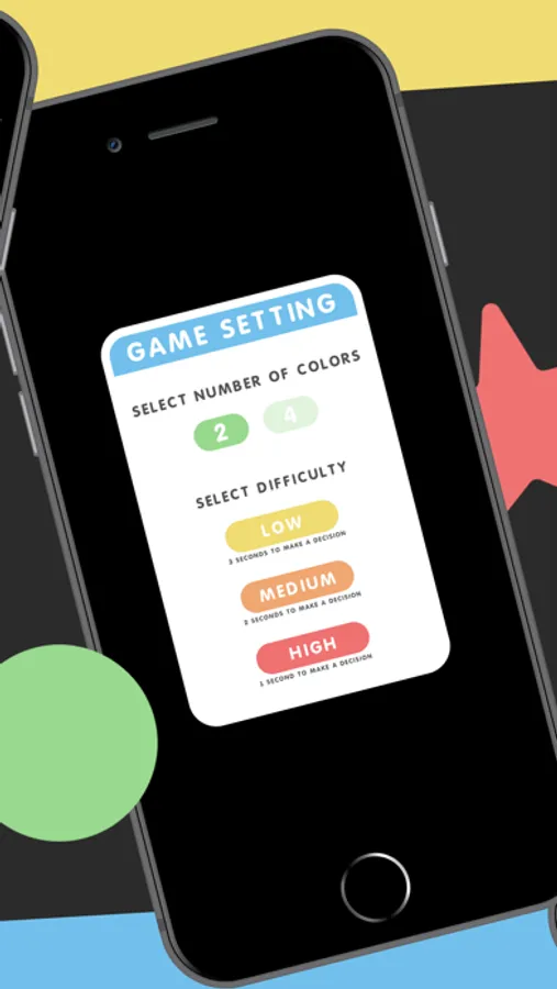 As your skill grows, you can choose between different difficulty presets. The higher the challenge – the fewer seconds you have time to make a decision. Moreover, you could even add more colors on the screen to match your progression.