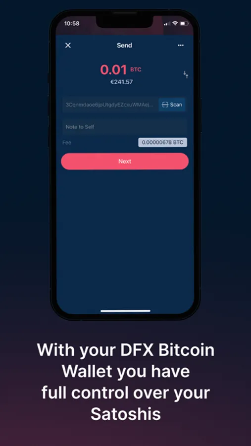 DFX Bitcoin Wallet allows you to store, send and receive Bitcoin with a focus on security and simplicity. You own your private keys at all times. Bank to Wallet, Wallet to Bank.