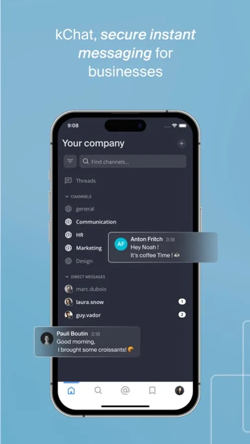 The kChat app requires an Infomaniak account with kSuite which requires a subscription. It enables you to communicate live with your teams and organise your projects within a unified communication platform.