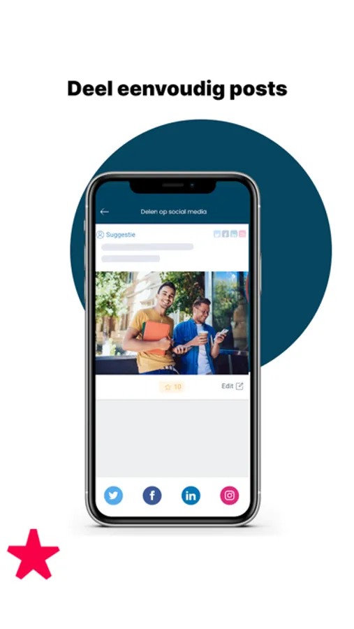 Het werkt heel eenvoudig. Jij legt je collega’s of andere stakeholders kant-en-klare berichten voor. Zij publiceren deze vervolgens met een druk op de knop (binnen de app) op hun persoonlijke kanalen of hun bedrijfskanalen. Vrijwillig natuurlijk. En zodra ze iets willen aanpassen, kan dat natuurlijk ook.