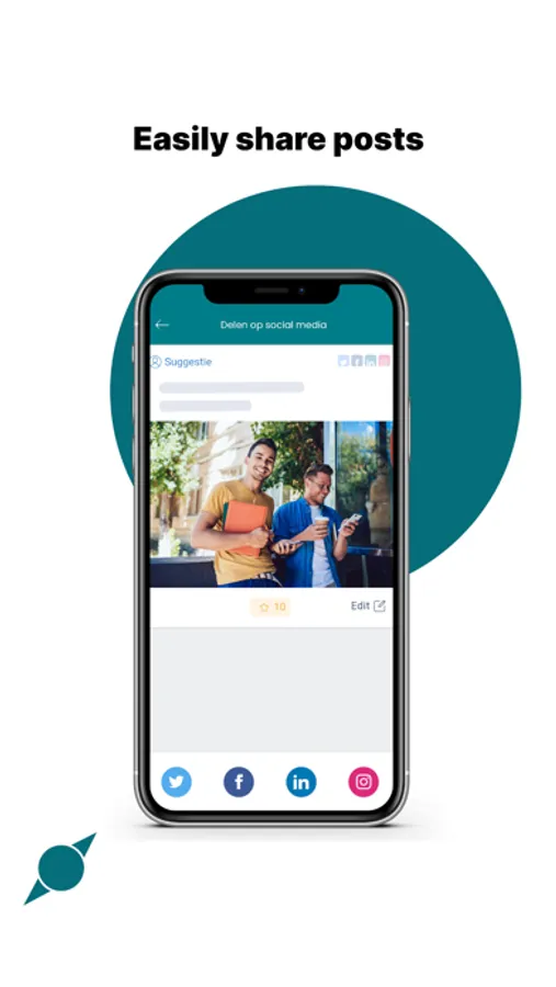 Het werkt heel eenvoudig. Jij legt je collega’s of andere stakeholders kant-en-klare berichten voor. Zij publiceren deze vervolgens met een druk op de knop (binnen de app) op hun persoonlijke kanalen of hun bedrijfskanalen. Vrijwillig natuurlijk. En zodra ze iets willen aanpassen, kan dat natuurlijk ook.