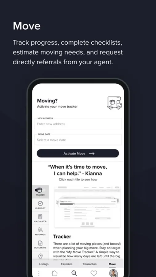 My Move: View move progress, estimate moving needs, complete checklists, and receive service referrals or second opinions from your agent.