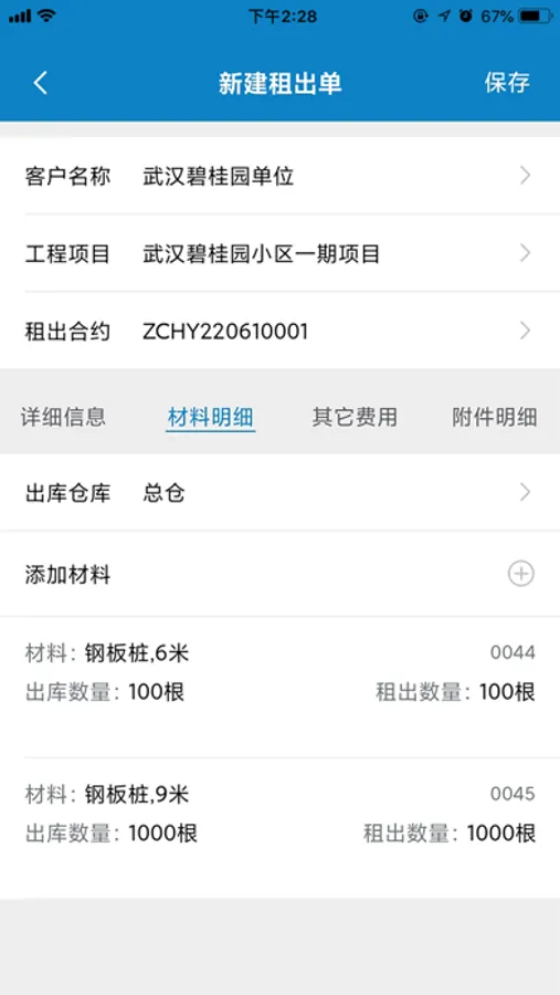 用户可通过APP进行材料管理,出库可带出对应客户信息,快速进行出库作业。
