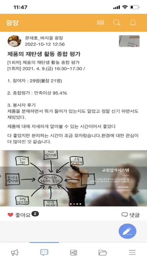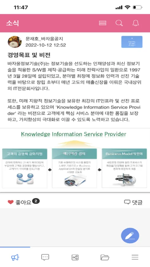 기업, 협회 , 단체들의 커뮤니케이션과 커뮤니티를 위한 서비스입니다.정보교류, 물물교환, 자료실 등. 기업 및 단체 활동에 필요한 쉽고 편리한 소통과 커뮤니티를 중심으로 한 서비스입니다.