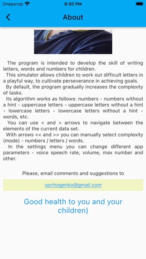 The program is intended to develop the skill of writing letters, words and numbers for children.