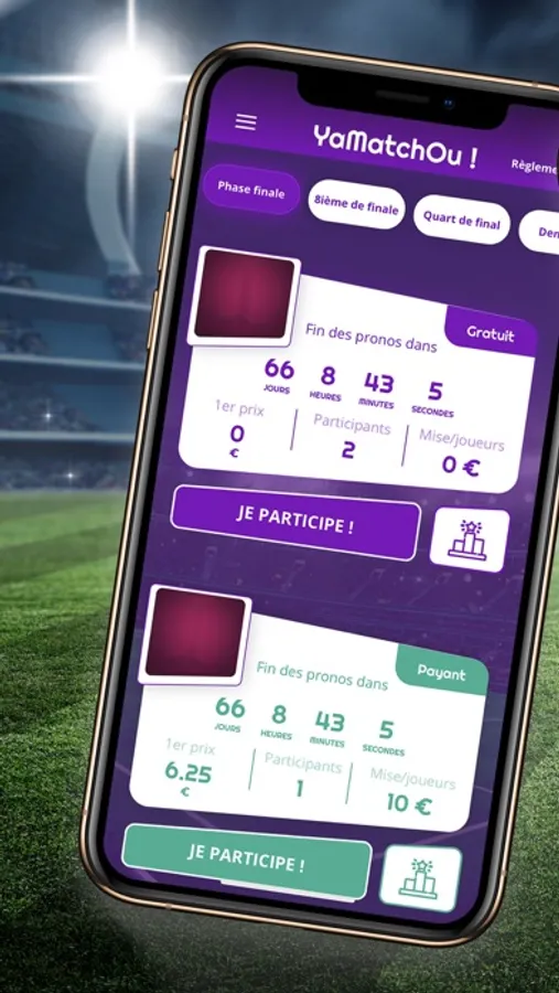 YaMatchOu est l'application qui te permet de pronostiquer des matchs de foot. Compare tes résultats à ceux de tes amis, tes proches, ta famille et deviens le meilleur pronostiqueur.