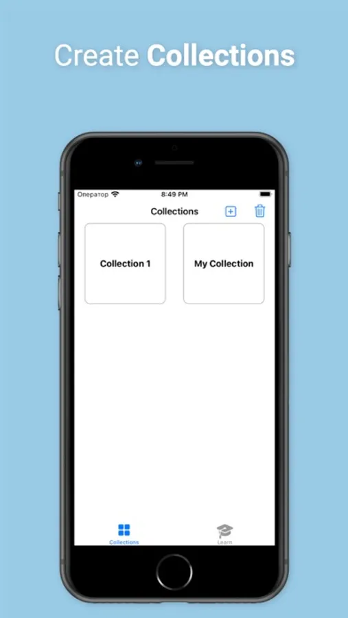 Use collections to categorize cards by topic. You can edit collections and cards whenever you want to. To mark a card as learned, click on the grey check mark.