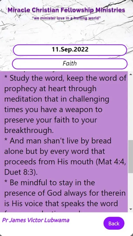 Miracle Christian Fellowship Ministries (MCFM), is a pentecostal church situated in Nangabo, Kasangati Town Council, Wakiso District. It was started on 4th August 1996 by Pastor James Victor Lubwama. with our app you will get instant access to our services ; the audio sermons are well presented, the livestream is well presented, the notes taken down from each service will be uploaded to the app for the readers, contacting us has never got any easier with a click of a button, any financial transactions are now present e.g. bank accounts, mobile money, send wave and the pledges are easily sent using our app, for the people who enjoy coments of our live stream, they are availble. are suitable gallery is now present in the app but for more pictures you will have to visit our website.