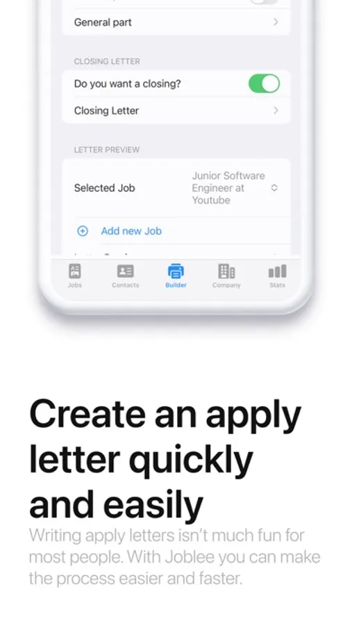 • Generate apply letters: Joblee can automatically generate custom apply letters based on the job listing you're interested in. You can send these apply letters by email directly from within the app and even attach your resume as an attachment.