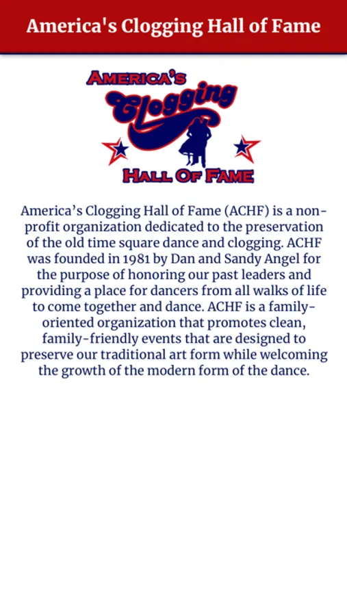 America’s Clogging Hall of Fame (ACHF) is a non-profit organization dedicated to the preservation of the old time square dance and clogging. Stay up-to-date on all things ACHF, ask us questions in our live chat, access featured videos, and more! Coming soon... "directors only access" for our official registered directors!