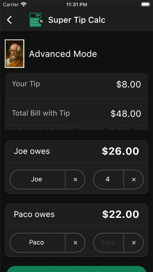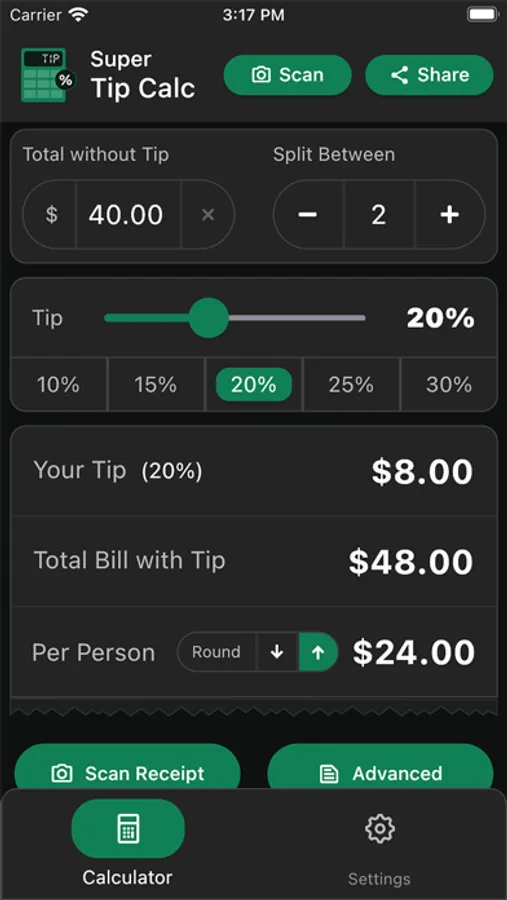 Super-Simple way to calculate the tip and split the bill! Use your camera to scan your receipt and fill in the Total Bill automatically!