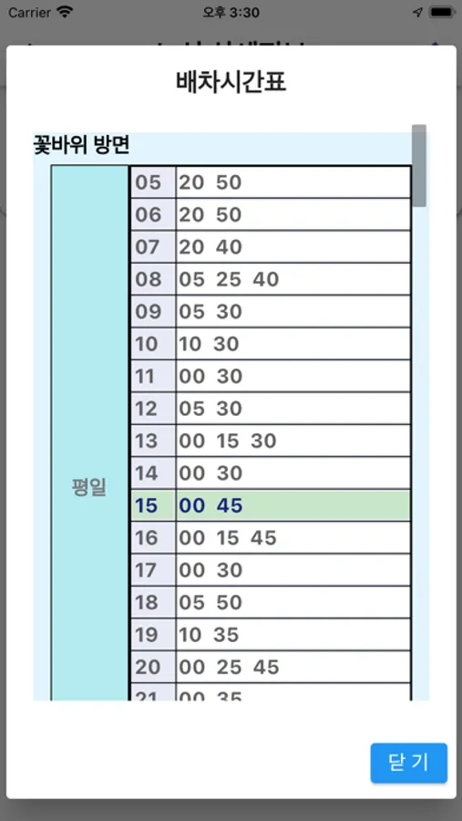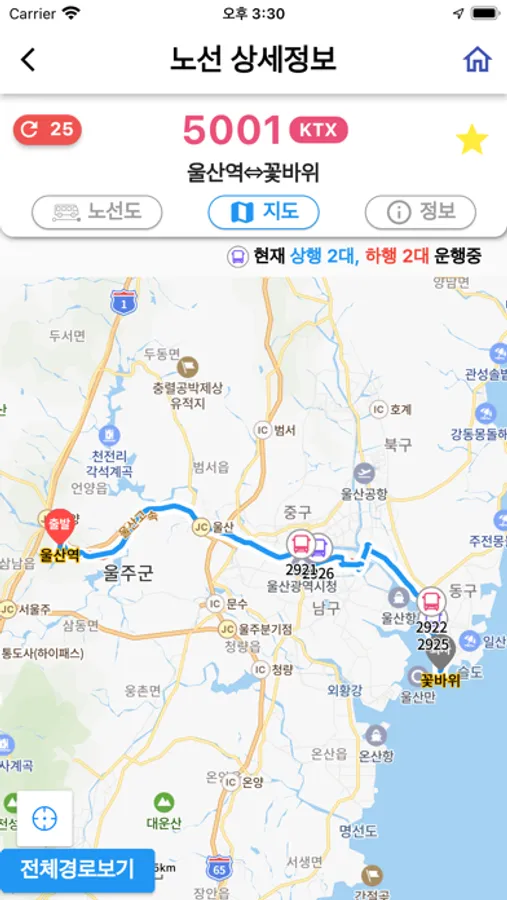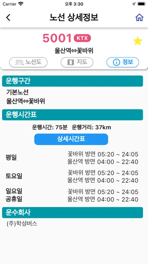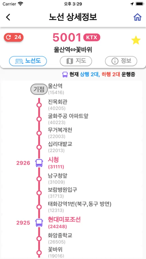 2. 노선검색 : 버스번호 검색결과에서 노선번호를 지정하면 선택한 노선의 차량별 현재위치정보와 경로정보, 그리고 해당 노선의 운행시간표가 제공되며, 경로정보의 정류장을 선택하면 지정한 정류장의 버스도착정보 제공화면으로 이동합니다.