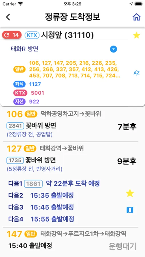 4. 환승정보 : 지명/주요시설/건물명/상호 등 관심지점 검색을 통하여 출발지와 목적지를 입력하면 이동 가능한 최적의 직행 또는 환승경로 정보와 함께 노선 도착정보가 표시되며, 최초 출발지는 자동으로 현재의 내위치로 지정됩니다.