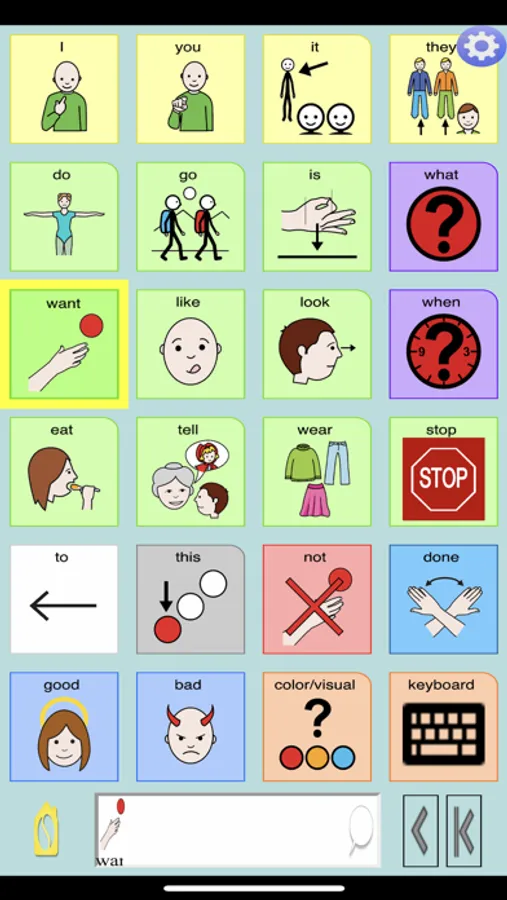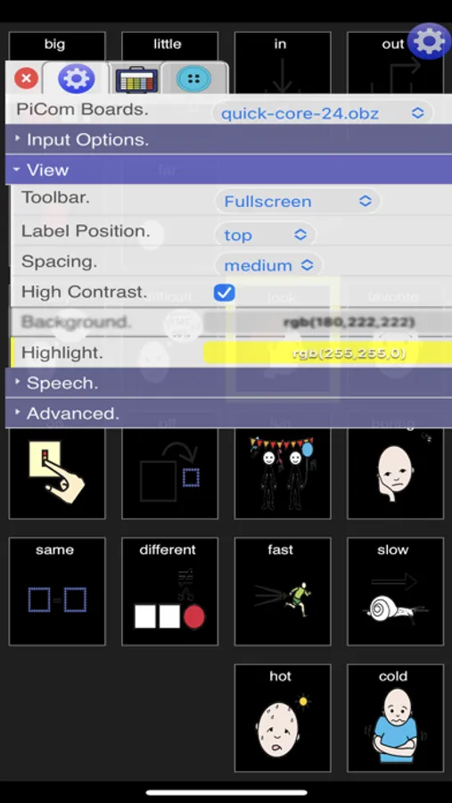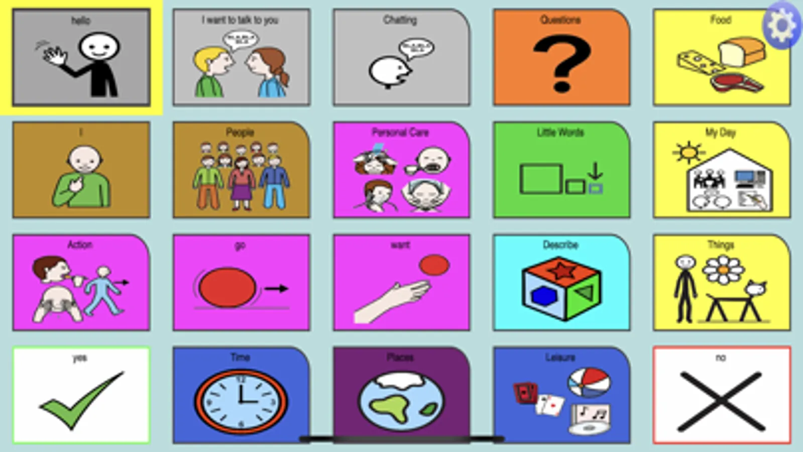 PiCom has some helpful visual features, allowing background and button colours to be modified extensively. It has a high contrast display and a zoom capability. The zoom capability provides the option for a user to work on one single very large communicator board, and move to distinct areas of the board which are displayed on the screen in detail.