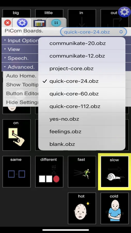 PiCom has the great advantage in being able to open and create communication boards or grids with the Open Board Format (.obf or obz). This means that boards can be freely exchanged between users, creators and the AAC Apps that can support Open Board format. When you download PiCom, it includes a range of well established communicator grids from experts in the field. You can then edit these, changing images and names to help the communication aid user. PiCom also has is own set of communication symbols, as well as linking to other symbols and the ability to use your own photos (and sounds). The advantages continue, because you can edit or create boards in PiCom, and share to your user's device or computer - the PiCom app and boards will be the same on all devices, including within a web browser.