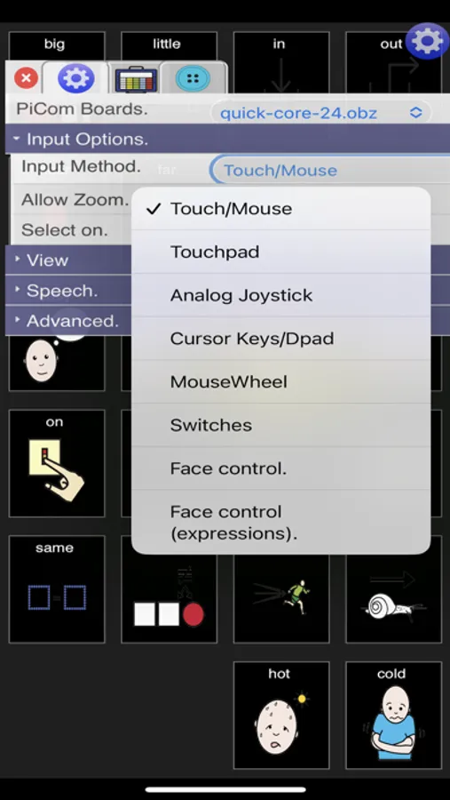 PiCom is also highly accessible for people who might have physical difficulties using a device. PiCom can be operated with bluetooth switches, Microsoft X Box Controller and Microsoft Adaptive Control, special external mice, some novel light touch control methods as well as face control. Face control requires more recent devices with high quality cameras and sufficient computing power.