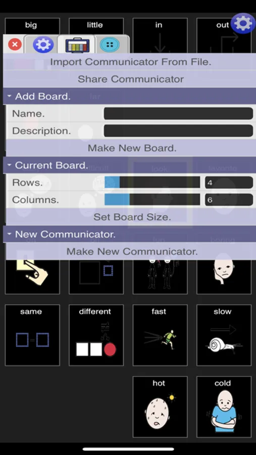 5. Create your own Communicators and boards from scratch, you can define sizes, use the button editor to populate each button, and export or share the creator communicator in the Open Board format .obz