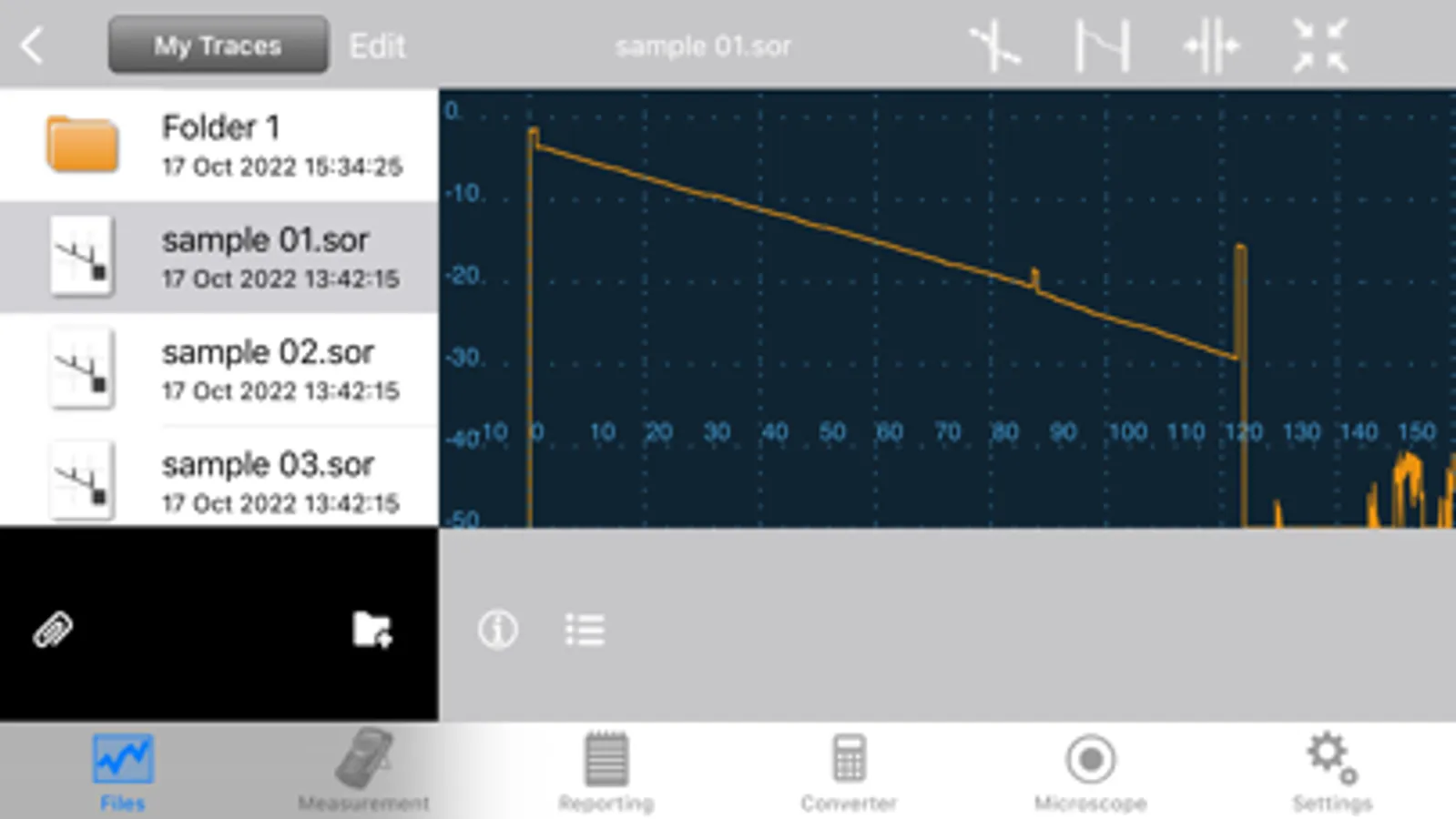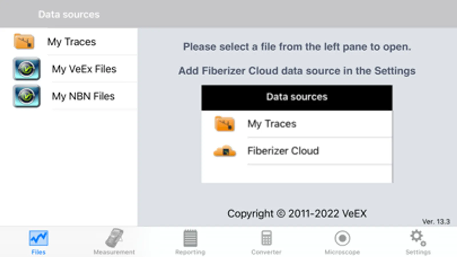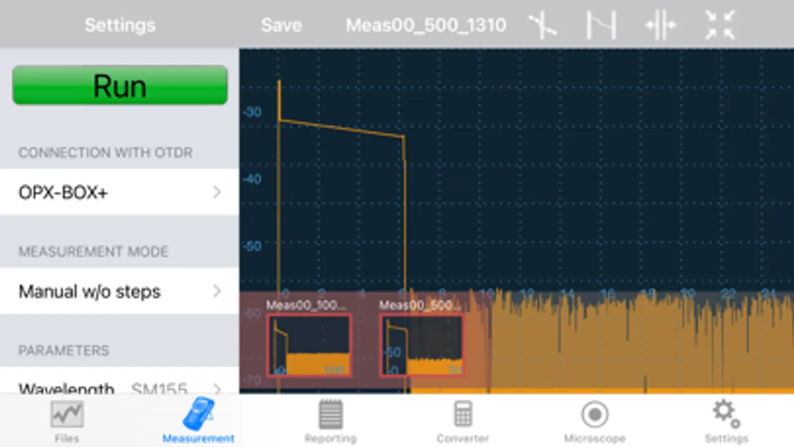 OPX-BOXe using WiFi; view OTDR traces; analyze/edit fiber optic test results. App supports VeEX Fiberscopes (DI-1000, DI-1000 MPO & DI-3000). Optimized for iPad screen layout. View connector end faces for contamination, pits and/or scratches. Pass/Fail Analysis in accordance with IEC-61300-3-35 standards. Save images in .jpg file format. Supports capture and analysis of single and MPO/MTP® multi-fiber end-faces. Saves OTDR and fiberscope results using default filenames, MyVeEX format in iPad. Push/Pull results to/from Fiberizer Cloud. View/retrieve results saved in iPhone, Fiberizer Cloud. Generate test reports.