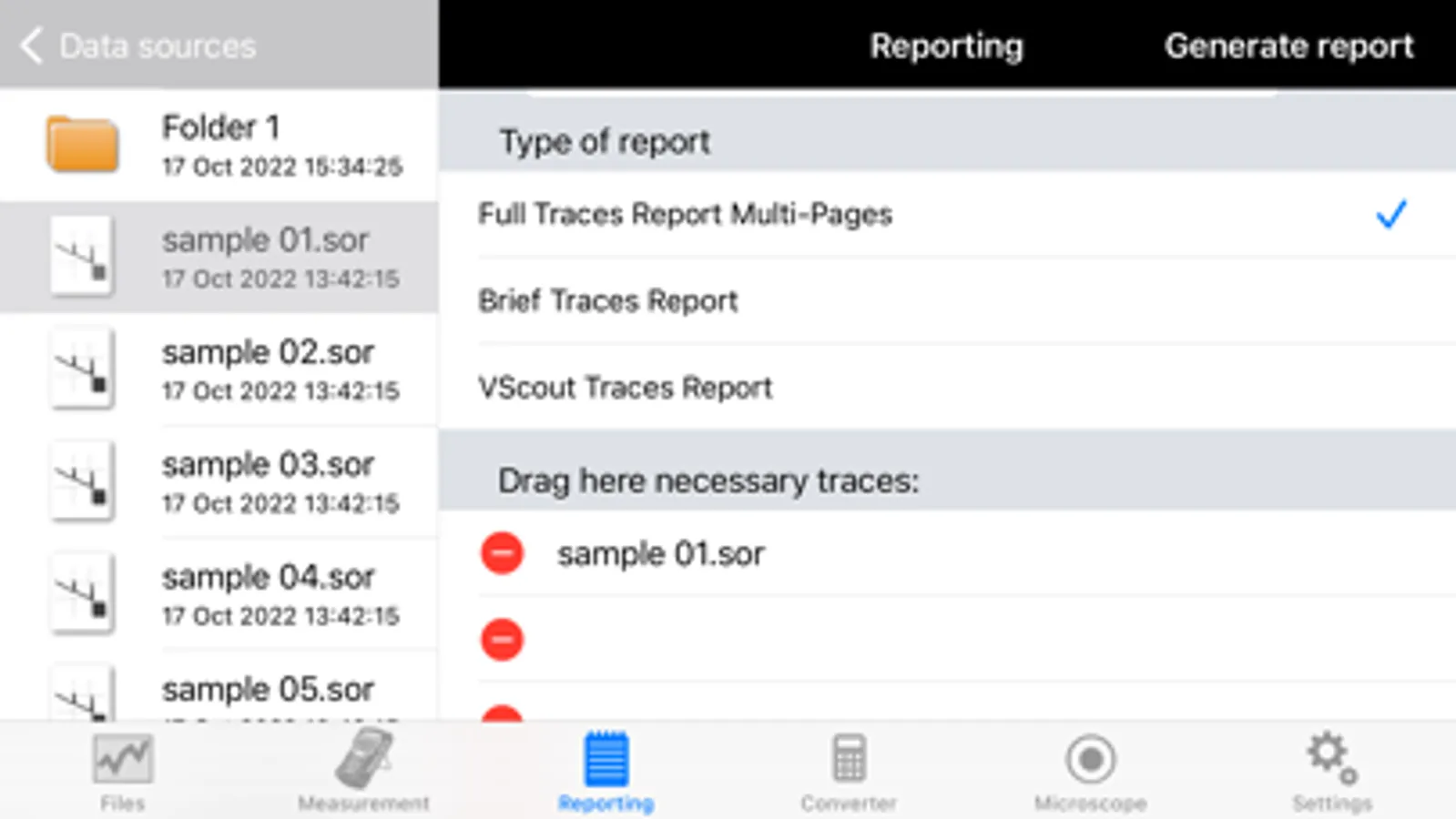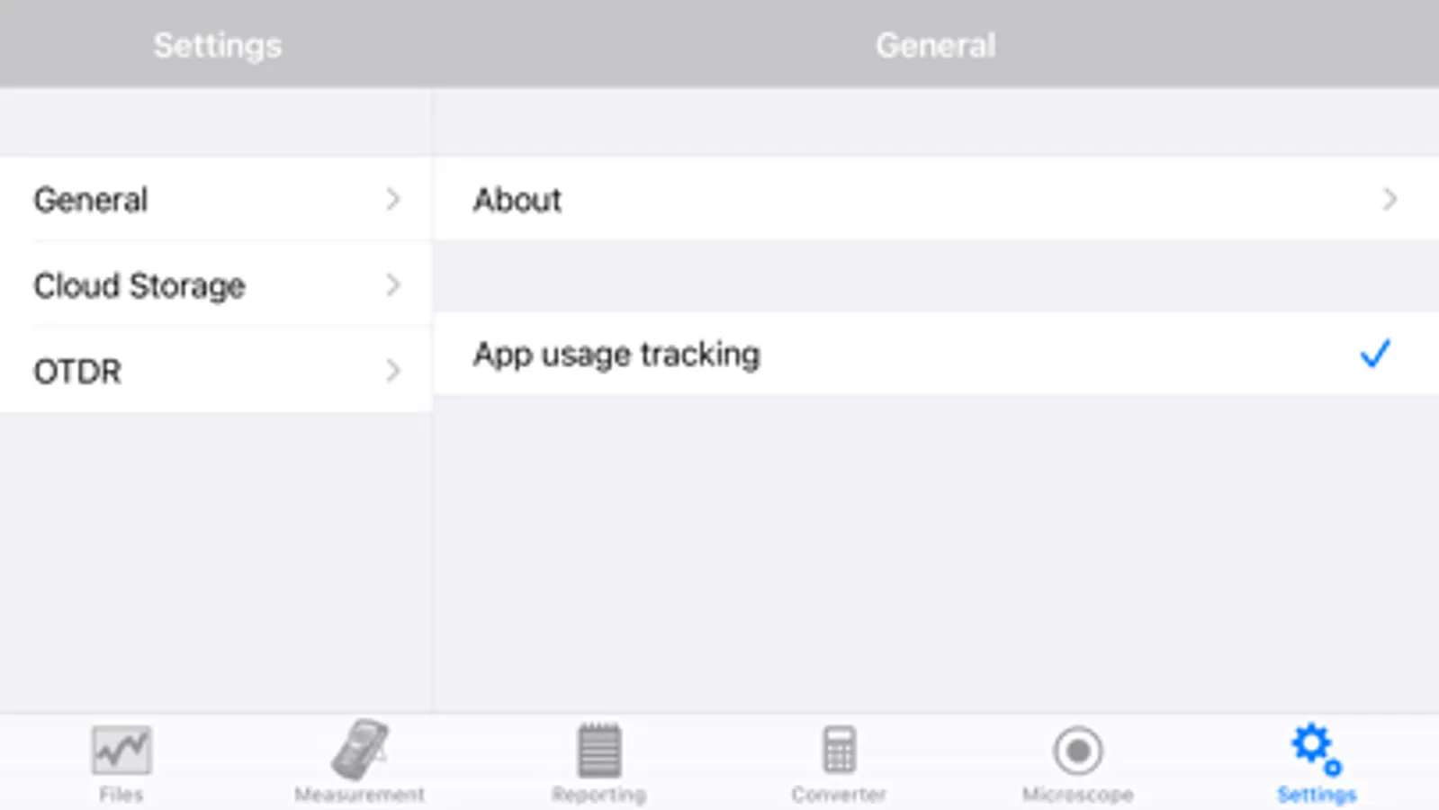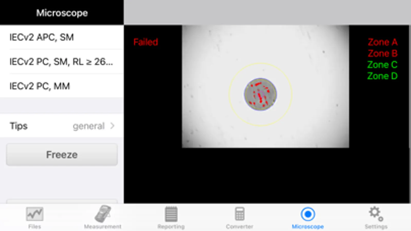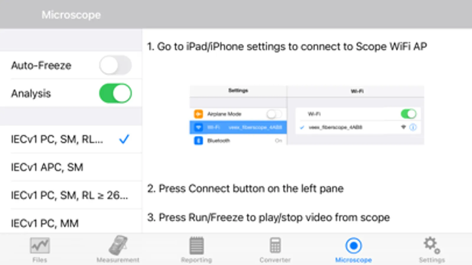 OPX-BOXe using WiFi; view OTDR traces; analyze/edit fiber optic test results. App supports VeEX Fiberscopes (DI-1000, DI-1000 MPO & DI-3000). Optimized for iPad screen layout. View connector end faces for contamination, pits and/or scratches. Pass/Fail Analysis in accordance with IEC-61300-3-35 standards. Save images in .jpg file format. Supports capture and analysis of single and MPO/MTP® multi-fiber end-faces. Saves OTDR and fiberscope results using default filenames, MyVeEX format in iPad. Push/Pull results to/from Fiberizer Cloud. View/retrieve results saved in iPhone, Fiberizer Cloud. Generate test reports.