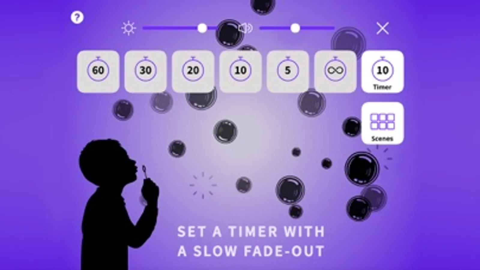 Choose a timer setting from 5 to 60 mins and the app will slowly fade out and gently shut off.