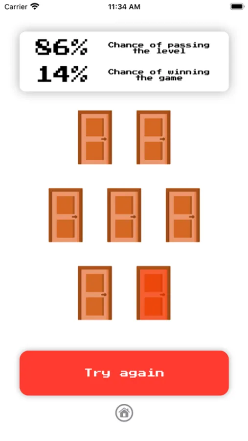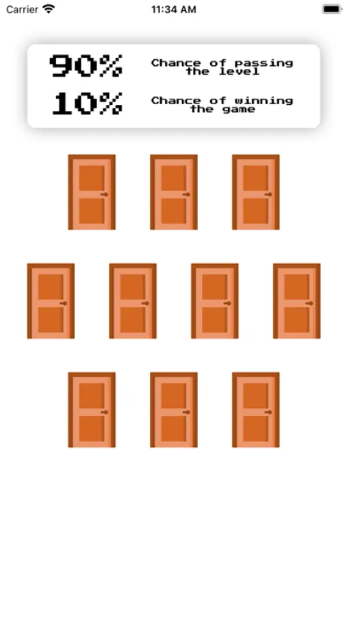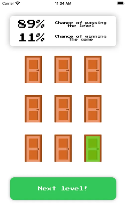Use this simple game as a fun opportunity to teach about probability. Users will have a chance to win the game by choosing a door that will take them to the next level, and avoiding the door that will end their game. This experience will provide people with the opportunity to learn more about conditional probability, expected probability, and actual probability as they compare their own success rate to what is expected throughout the game. Icon images provided by Flaticon.com.